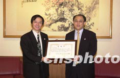 日本中華總商會(huì)28日捐資六百五十萬日元,支持中國抗擊非典型肺炎。圖為在捐款儀式上,中國駐日使館總領(lǐng)事張立國向總商會(huì)會(huì)長顏安(左)頒發(fā)感謝狀。中新社記者:陶光雄