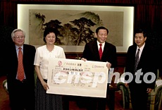 新加坡金鷹國(guó)際集團(tuán)主席陳江和先生,為支持廣東省抗擊“非典”,三十日向廣東省人民政府捐資五百萬元人民幣用于防治“非典”,廣東省省長(zhǎng)黃華華會(huì)見了陳江和一行并參加了捐贈(zèng)儀式。圖為黃華華向陳先生回贈(zèng)紀(jì)念品“同舟共濟(jì)”。作者:羅仰明