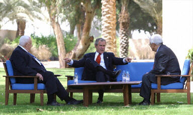 布什主持了巴勒斯坦自治政府總理阿巴斯與以色列總理沙龍之間的峰會,隨后結(jié)束就任總統(tǒng)兩年半來首次親自到中東進(jìn)行謀和的訪問。