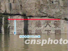 三峽水利樞紐壩前水位6月6日上午10時(shí),達(dá)到121.41米。瞿塘峽平湖景象已呈現(xiàn)出來(lái),而三峽著名的夔門(mén)摩崖石刻此時(shí)已經(jīng)被淹沒(méi)。圖為6月4日當(dāng)水位達(dá)到116.33米時(shí),夔門(mén)摩崖石刻向游人展示出告別前的景觀(guān)。中新社 圖
