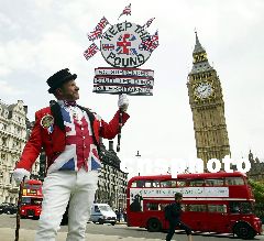 6月9日,英國財政大臣戈登·布朗宣布英國暫時不會加入歐元區(qū)。圖為英鎊的堅定支持者在英國首都倫敦街頭高舉標(biāo)語牌,號召維護英鎊,抵制歐元。Ic/cnsphoto 攝