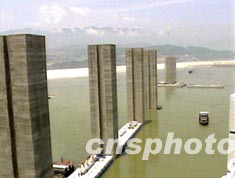 今日下午四時三十分,最后一艘導(dǎo)航浮船箱,被中國武警水電雄師精確定位于兩個浮堤支墩之間,八艘浮船箱在永久船閘前形成了一條南北各長二百五十米的“浮動安全墻”,為明日開始的船閘實(shí)船測試和十六日的試通航提供了安全保障。