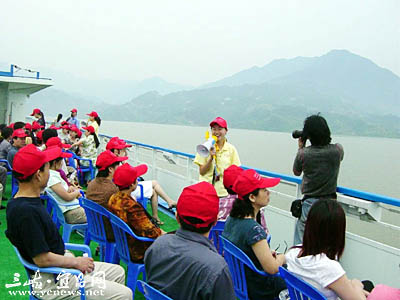 九點(diǎn)二十時(shí),三輛豪華大巴緩緩駛進(jìn)秭歸港。車剛停住,第一批一百多名頭帶紅帽的三峽高峽平湖游客,就急急走出汽車,不停地舉起手中的相機(jī)。冰凍了近兩個(gè)月的三峽旅游在一片閃光燈中解凍。