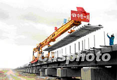 六月十二日清晨,青藏鐵路鋪軌順利通過海拔四千六百多米、全長十一點(diǎn)七公里的清水河特大橋。清水河特大橋位于可可西里無人區(qū),是青藏鐵路最長的以橋代路工程和重點(diǎn)控制工程之一。“以橋代路”主要是為解決高原凍土地帶路基穩(wěn)定問題,各橋墩間的一千三百多個(gè)橋孔可供藏羚羊等野生動(dòng)物自由遷徙。作者:趙匡胤