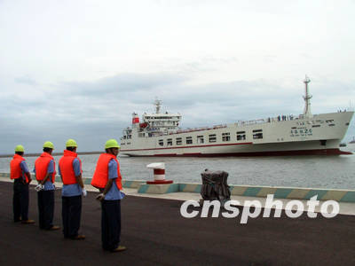 工程人員介紹說:“粵海鐵二號”到達(dá)?诤螅瑢⒃诃傊莺{粵海鐵路南、北港口之間進(jìn)行船、橋、港聯(lián)合調(diào)試,在滿足調(diào)試大綱的各項(xiàng)技術(shù)指標(biāo)要求并辦理交船和運(yùn)營手續(xù)后,與“粵海鐵一號”實(shí)現(xiàn)對開,一旦汽車運(yùn)輸、火車客運(yùn)獲批,將同時投入運(yùn)營。