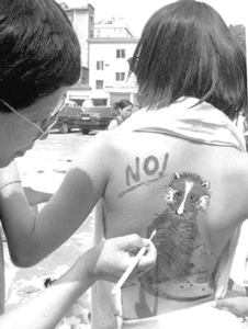 問題是,如今的人體彩繪,已不滿足于在藝術(shù)殿堂里,而是在室外在大庭廣眾之下大行其道,其目的也不是要普及什么藝術(shù)文化,所圖的或許只有一個(gè)動(dòng)機(jī),那就是為商家推銷商品。這就值得認(rèn)真分析了。