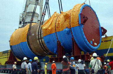 據(jù)“中央社”報(bào)道,“核四”反應(yīng)爐壓力容器主體及配件共32件數(shù)日前運(yùn)抵基隆港靠岸,原預(yù)定17日凌晨卸載,由于天公不作美、海象不佳,在港口等待數(shù)日。該反應(yīng)爐重達(dá)107噸,長(zhǎng)24米、寬9米、長(zhǎng)10米,是個(gè)超級(jí)巨無(wú)霸,從日本運(yùn)抵臺(tái)灣,只有荷蘭籍巴卡尼號(hào)全球唯一足夠噸位的重件船,可以載得動(dòng)。