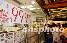 香港諸多旅行社六月二十日推出九百九十九元內(nèi)地十二個城市旅游專線,由于其價格低廉堪稱空前,吸引眾多港人排隊報名。