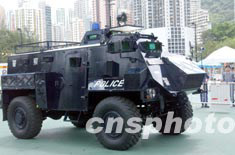 香港警務(wù)處2003年6月22日在香港維多利亞公園舉行的“同心攜手畫出彩虹”嘉年華活動(dòng)上,展示警用“Saxon撒臣裝匣運(yùn)兵車”。 中新社記者 錢興強(qiáng)