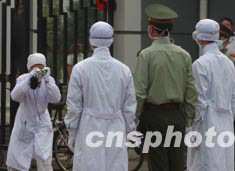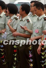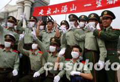 警衛(wèi)北京小湯山專(zhuān)治非典戰(zhàn)地醫(yī)院五十余天的武警官兵,在病人全部康復(fù)出院后,慶賀勝利完成任務(wù)。中新社記者:賈國(guó)榮