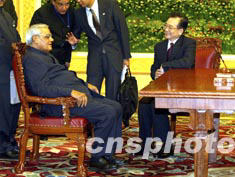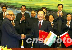 中國(guó)國(guó)務(wù)院總理溫家寶與印度總理瓦杰帕伊二十三日晚在北京簽署《中印關(guān)系原則和全面合作宣言》。中新社記者:滿會(huì)喬