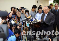 世界衛(wèi)生組織6月23日將香港剔除出疫區(qū),特首董建華隨即到淘大花園舉行記者會,并向在SARS疫癥中死難者哀悼。 中新社記者 洪少葵