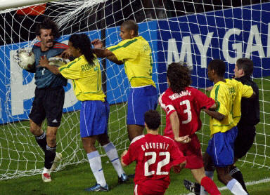巴西隊開場后占據(jù)優(yōu)勢。第23分鐘,盧西奧長傳,阿德里亞諾突入禁區(qū),將球挑過魯斯圖的頭頂,巴西隊1比0領(lǐng)先。