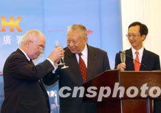 香港特首董建華、財(cái)政司長梁錦松及投資推廣署長盧維思,6月24日在禮賓府特設(shè)酒會(huì),舉杯祝賀來港投資的中外企業(yè)代表在港開業(yè)擴(kuò)充業(yè)務(wù)。 中新社記者 洪少葵