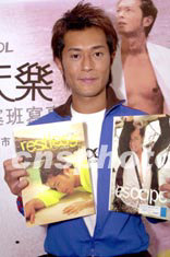 影視紅星古天樂6月27日在香港出席首張寫真AVCD發(fā)布會,大會特別安排美女相伴左右為他造勢。中新社記者 鄧慶樂