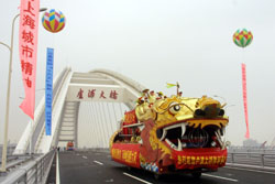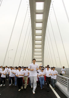 中新網(wǎng)6月28日電 世界上跨度最大的鋼拱橋——上海盧浦大橋,二十八日上午正式建成通車,小巨人姚明帶領(lǐng)千名中外長跑愛好者參加了主題為“活力上海,奔向未來”跨橋長跑活動。