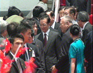 中新網(wǎng)6月29日電 中國(guó)國(guó)務(wù)院總理溫家寶今天11:50時(shí)許乘專機(jī)抵達(dá)香港國(guó)際機(jī)場(chǎng)。香港特區(qū)行政長(zhǎng)官董建華等到機(jī)場(chǎng)迎接。
