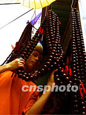 六月三十日,一名小男孩在北京一處寺廟旅游圣地選擇旅游紀(jì)念品。北京旅游“禁令”解除后,旅游紀(jì)念品攤點(diǎn)爭相開業(yè),以減少“非典”造成的損失。中新社記者 宋吉河 攝