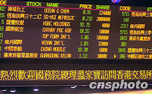 國務(wù)院總理溫家寶六月三十日下午到香港交易所參觀,交易所屏幕即時打出歡迎溫總理到訪字句。中新社記者 錢興強 攝