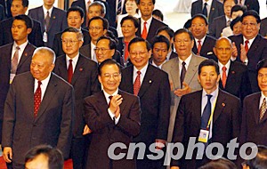 在樂(lè)聲、掌聲中,溫家寶等主要嘉賓在主席臺(tái)就坐。他的背後墻壁上懸掛著鮮艷的國(guó)旗和區(qū)旗。