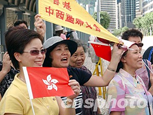 香港特區(qū)政府為慶;貧w祖國六周年,7月1日早上在灣仔金紫荊廣場(chǎng)舉行升旗禮,圖為參與觀禮的市民十分興奮。中新社記者 錢興強(qiáng) 攝