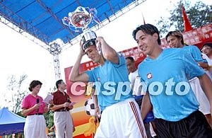 在香港慶;貧w祖國六周年足球嘉年華比賽中,獲得冠軍的香港漁民互助社足球隊(duì)興高彩烈上臺(tái)領(lǐng)獎(jiǎng)。洪少葵 攝