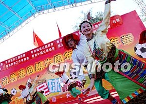 為慶祝香港回歸祖國六周年,香港十個(gè)團(tuán)體合作籌辦的“慶祝回歸祖國六周年足球嘉年華”一連三天在維園舉行。圖為7月1日典禮儀式上龍獅起舞,歡慶佳節(jié)。洪少葵 攝