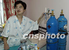 7月2日,三十歲的楊冬梅在陽光明媚的家中熟練地操作吸氧開關。楊冬梅5月16日身染SARS病毒后病情危殆,經過有創(chuàng)機械通氣等治療搶救奇跡般康復,上周五從宣武醫(yī)院出院。她是北京數(shù)十名采用有創(chuàng)機械通氣治療患者中幸存的三人之一,目前在家中間斷吸氧和服藥,精神和身體狀況一天比一天好。中新社記者 任晨鳴 攝