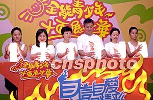 香港「2003年青少年暑期活動」7月2日舉行記者會,民政事務總署署長陳甘美華(左三)、與青少年暑期活動委員會主席陳振彬(左四)等人與活動大使Twins蔡卓妍(右一)及鍾欣桐(左一)攜手主持揭幕亮燈儀式。鄧慶樂 攝
