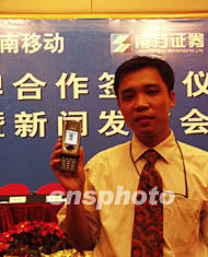 海南移動與南方證券七月二日在?谂e行合作開發(fā)GPRS手機炒股新業(yè)務簽字儀式。該業(yè)務開海南電信業(yè)和證券業(yè)合作的先河。圖為儀式上海南移動工作人員展示股票圖形。作者:王辛莉
