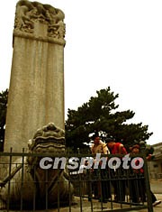 七月四日,中國北京明十三陵作為明清皇家陵寢的擴(kuò)展項目被列入世界文化遺產(chǎn)名錄,一時吸引不少游人前來參觀。圖為游客對十三陵中定陵前的石碑產(chǎn)生濃厚興趣,明十三陵每處皇陵前都有類似烏龜馱石碑的石雕。中新社記者 宋吉河 攝