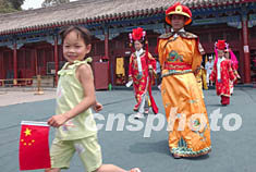 身穿清代服裝的游客七月四日在北京故宮午門前準備拍照。隨著北京故宮旅游的逐漸復蘇,受非典影響停業(yè)兩個多月的古裝攝影也開始恢復營業(yè)。中新社記者 張煒 攝