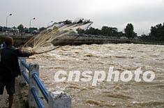 七月四日,安徽淮河水情仍不容樂觀,淮河王家壩分洪閘繼續(xù)全開閘口分洪,當(dāng)?shù)夭糠秩罕姷介l前捕魚。中新社記者 盛佳鵬 攝