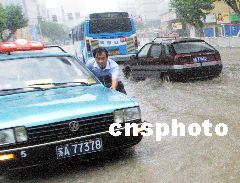 今天早晨可以看到,南京城區(qū)幾乎所有路面都有積水,不少地段水深超過半個自行車輪子,下關一些街道的積水甚至深達一米多,公交及出租車在水中緩慢移動著,路邊隨處可見排氣管進水拋錨的車輛。在新街口至中央路一線,多處路段水深過膝,不少趕時間的市民們艱難地涉水前行。