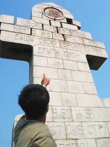 這座由沙俄建立的紀(jì)念碑呈十字架形,高6米,寬0.7米,以灰白色花崗巖砌筑,碑的上端鑲嵌著圓形彩色“圣母”頭像,下面鐫刻著俄文。日期為1904至1905年,即“日俄戰(zhàn)爭”的時(shí)間。
