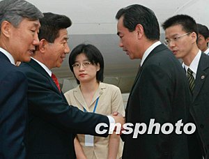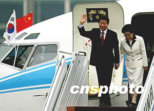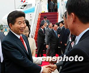中新社北京七月七日電 應(yīng)中國國家主席胡錦濤的邀請,韓國總統(tǒng)盧武鉉今天上午抵達(dá)北京,開始對中國進(jìn)行為期四天的國事訪問。