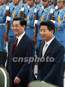 中國國家主席胡錦濤七日在北京舉行儀式歡迎韓國總統(tǒng)盧武鉉訪華。中新社記者:滿會(huì)喬