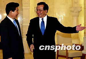 應(yīng)中國國家主席胡錦濤的邀請,韓國總統(tǒng)盧武鉉于7日至10日對中國進行國事訪問。胡錦濤7日下午在人民大會堂與來華進行國事訪問的韓國總統(tǒng)盧武鉉舉行會談時稱,在新世紀建立和發(fā)展中韓全面合作伙伴關(guān)系將開創(chuàng)中韓睦鄰友好和互利合作的新局面。