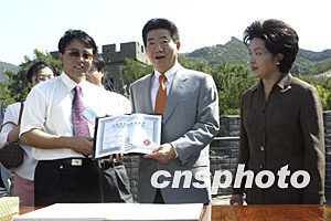 盧武鉉與夫人登上北京八達嶺長城,并獲得登城證書。中新社記者:毛建軍