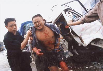 7時(shí)32分,記者正好途經(jīng)事故第二現(xiàn)場(chǎng)。在成渝高速公路18km+600m處的超車道上,5輛汽車撞在了一起,遍地都是殘缺的車身和玻璃渣,排第3的一輛川M05049白色福田小貨車被前后兩輛大東風(fēng)貨車夾成了“三明治”,嚴(yán)重變形的車身已經(jīng)縮短了一半,駕駛室里傳出陣陣撕心裂肺的哭嚎:“救命!快點(diǎn)把我們拉出來(lái)啊!”坐在最右邊的馬偉用在駕駛室外的左手拼命地拍打著車殼,他的左邊,滿臉鮮血的劉德志表情茫然,司機(jī)周長(zhǎng)生則斜躺在劉德志的左肩沒(méi)了聲息。