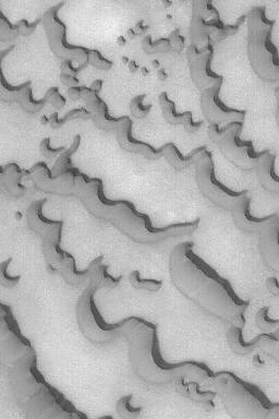 7月13日,來自美國國家航空和宇航局(NASA)的火星全球測量員(MGS)和火星衛(wèi)星照相機(MOC)的圖片顯示,火星北極冰冠附近的沙丘。冰冠被大片受風(fēng)吹蝕的黑暗沙丘包圍。