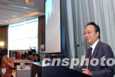 澳門社會事務(wù)及文化司長崔世安在香港出席“新形式下國際旅游合作大會”部長圓桌會議時,不忘向業(yè)界人士推介澳門旅游業(yè)。中新社記者:洪少葵