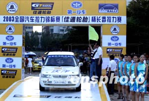 因受“非典”影響而推遲的中國(guó)汽車?yán)惖诙颈荣?5日晚移師吉林省長(zhǎng)春市,來(lái)自全國(guó)的56輛賽車參加本次比賽,吉林省省長(zhǎng)洪虎為北京慶洋車隊(duì)著名車手任志國(guó)揮旗發(fā)車。中新社記者:趙振清