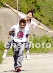 歌影紅星古巨基7月16日在香港飛鵝山為其新歌《天堂流淚》拍攝MV。圖為古巨基在音樂特輯中背著李彩樺于斜路上奔走。中新社記者:鄧慶樂