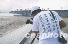 臺灣東森電視臺、中天電視等九家臺灣媒體,和中國新聞社、人民日報等八家著名媒體組成的海峽兩岸聯(lián)合采訪團共二十五名記者,七月中旬來到三峽工地進行聯(lián)合采訪。圖為臺灣電視攝像記者在三峽工地拍攝。作者:孫榮剛
