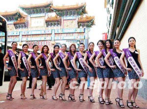二○○三年紐約華裔小姐選美會(huì)決賽入圍佳麗日前到首都華盛頓探訪當(dāng)?shù)貎S團(tuán),并參觀國(guó)會(huì)山莊。圖為眾佳麗在華盛頓中國(guó)城牌坊前合影。作者:龔高