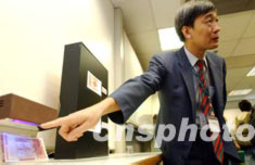 香港商業(yè)罪案調(diào)查科專家余社長,7月18日向新聞界講述偽鈔辨別方法。香港警方7月17日搗破了一個(gè)制造偽鈔的工場,檢獲一批面值一百元的偽鈔和制造工具。中新社記者:洪少葵