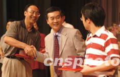首都醫(yī)科大學(xué)宣武醫(yī)院院長(zhǎng)張建(中),十八日在北京舉行的“宣武醫(yī)院抗擊SARS大捷慶功大會(huì)”上,向新華社、人民日?qǐng)?bào)等參與采訪抗擊SARS一線醫(yī)護(hù)人員的三名記者,授予宣武醫(yī)院永久院?jiǎn)T榮譽(yù)稱號(hào),并頒發(fā)證書(shū)和獎(jiǎng)品。中新社記者:鄒憲
