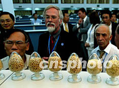 出席第五屆亞歐經(jīng)濟(jì)部長(zhǎng)會(huì)議的官員們利用會(huì)議間歇,來(lái)到大連商品交易所,查看大豆等交易商品的樣品。中新社記者:鄭萍萍