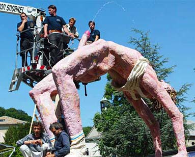 中新網7月26日電 英國王子查爾斯即將抵達奧地利城市薩爾茲堡參加藝術節(jié)的前一天晚上,人們?yōu)橐蛔鹁扌偷哪凶铀芟衽e行了揭幕儀式。但是,幕布揭去之后,人們居然看到這尊塑像的陰莖竟然長達兩英尺。這一奇觀立刻在市民們當中引起了激烈的爭論。